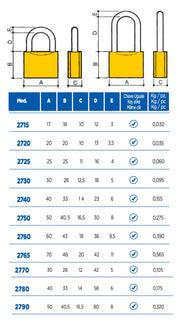 Lucchetto professionale Potent Serie 2700, un punto di riferimento per la sicurezza meccanica. Realizzato con corpo in ottone massiccio e arco in acciaio cementato, questo lucchetto è progettato per offrire massima resistenza e durata nel tempo, sia in ambienti interni che esterni.